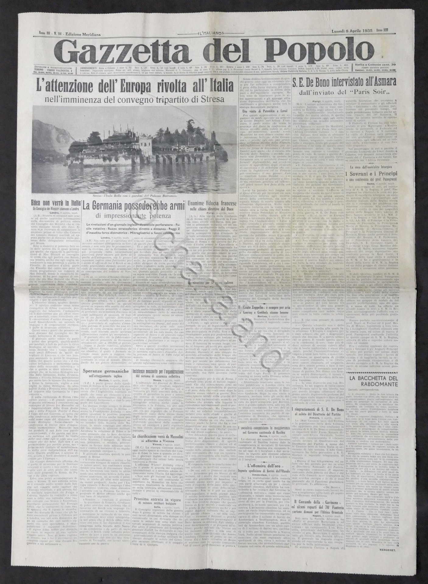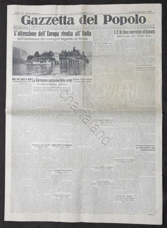 Giornale Gazzetta del Popolo N. 84 Merid. - L'attenzione dell'Europa rivolta all'Italia - 1935 Testo in lingua italiana, Pag. 8 con illustrazioni Condizioni buone