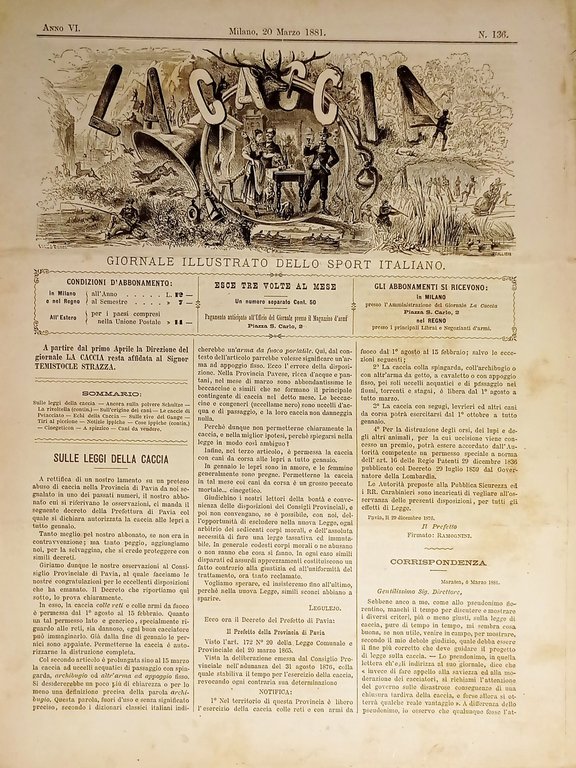 Giornale Illustrato dello Sport Italiano - La Caccia N. 136 - 20 Marzo 1881 Testo in lingua italiana. Pagine 8 con illustrazioni. Condizioni buone come da foto.