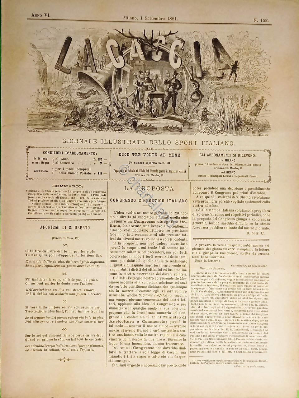 Giornale Illustrato dello Sport Italiano - La Caccia N. 152 - 1 Settembre 1881 Testo in lingua italiana. Pagine 8 con illustrazioni. Condizioni buone come da foto.