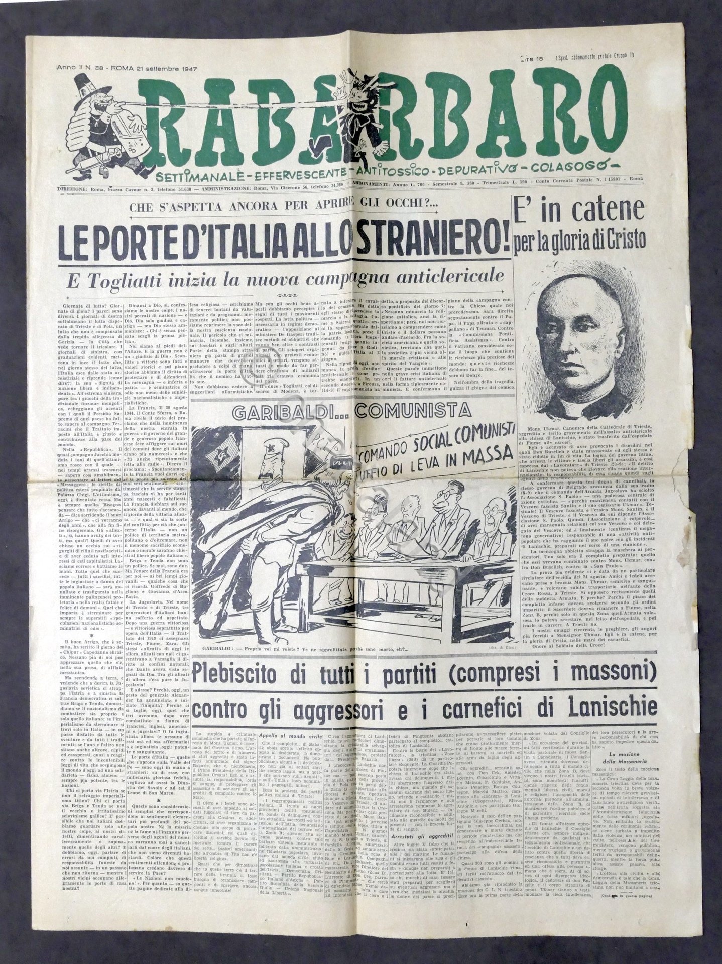 Giornale Settimanale Satira - Rabarbaro N. 38 Roma - 1947 Anticomunismo Testo in lingua italiana, Pag. 4 con illustrazioni Condizioni buone come da foto