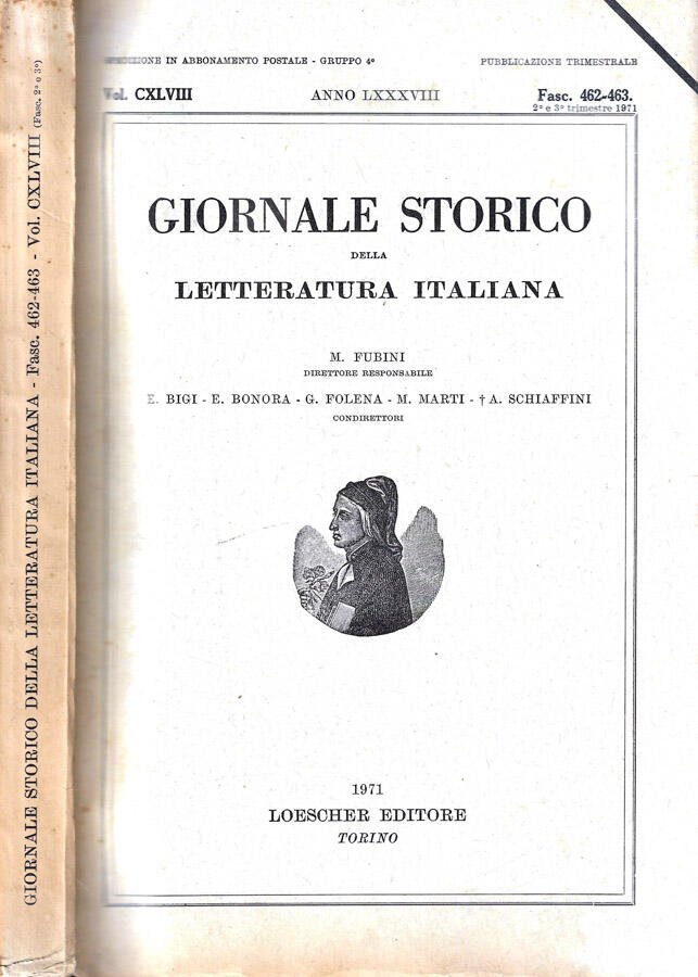 Un solo fascicolo doppio, n. 462-463 del vol. CXLVIII anno 1971, della pubblicazione trimestrale diretta da M. Fubini insieme a E. Bigi, E. Bonora, A. Schiaffini, G. Folena e M. Marti. Brossura in cartoncino, leggermente brunita in particolare al dorso, consumata lungo i margini e con lieve piega da scaffale al piatto posteriore. Pagine ingiallite, ancora intonse, ben salde, con ampio margine e note al piede. Numero pagine 321 (numerate da 159 a 480).