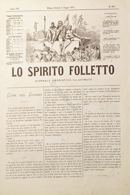 Giornale Umoristico Illustrato - Lo Spirito Folletto N. 627 - 5 Giugno 1873 Testo in lingua italiana. Pagine 8 con illustrazioni. Copertina morbida. Condizioni buone come da foto.