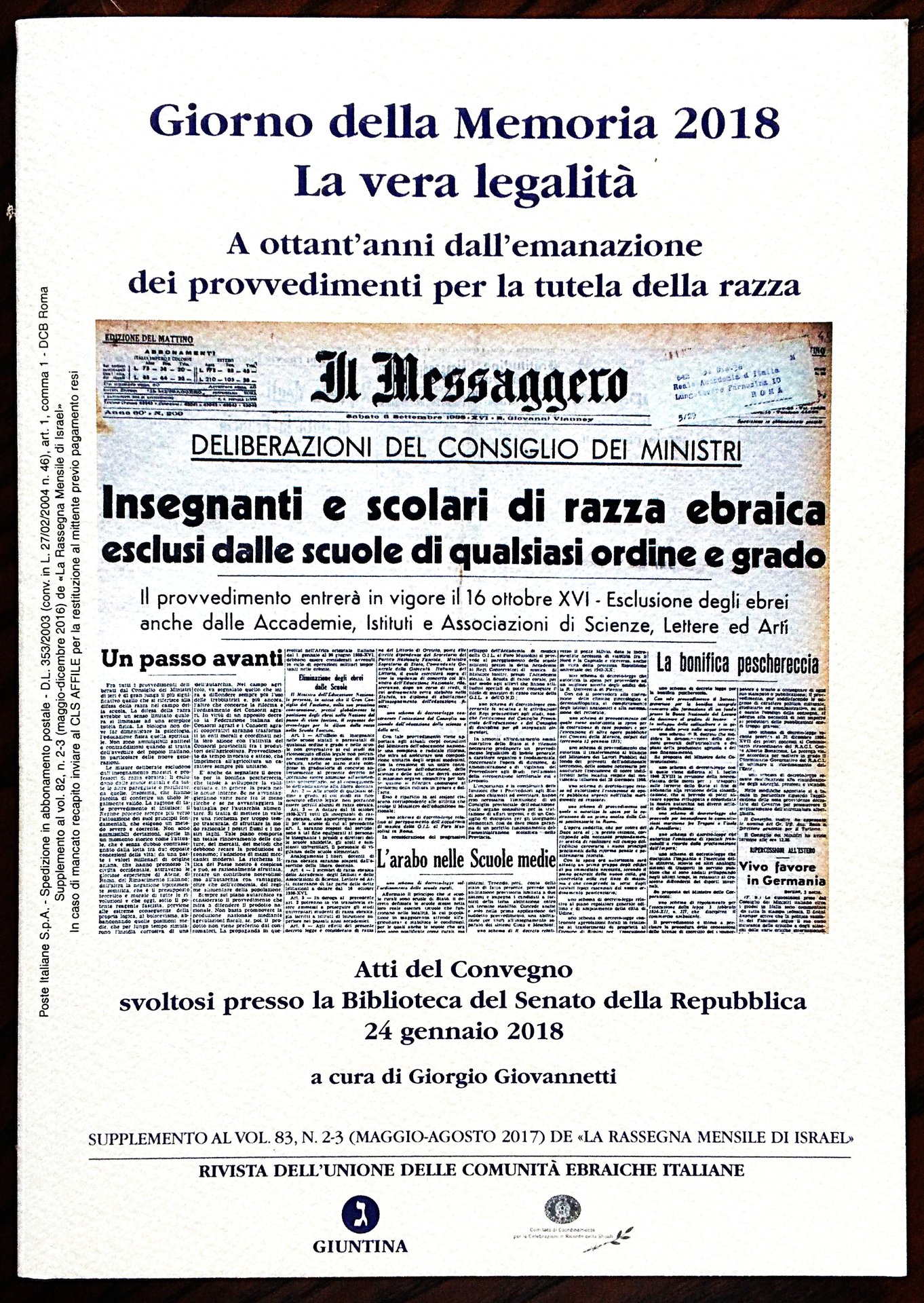 Giorno della Memoria 2018. La vera legalità. A ottant'anni dall'emanazione dei provvedimenti per la difesa della razza. Atti del Convegno svoltosi presso la Biblioteca del Senato della Repubblica 24 gennaio 2018. A cura di Giorgio Giovannetti.
