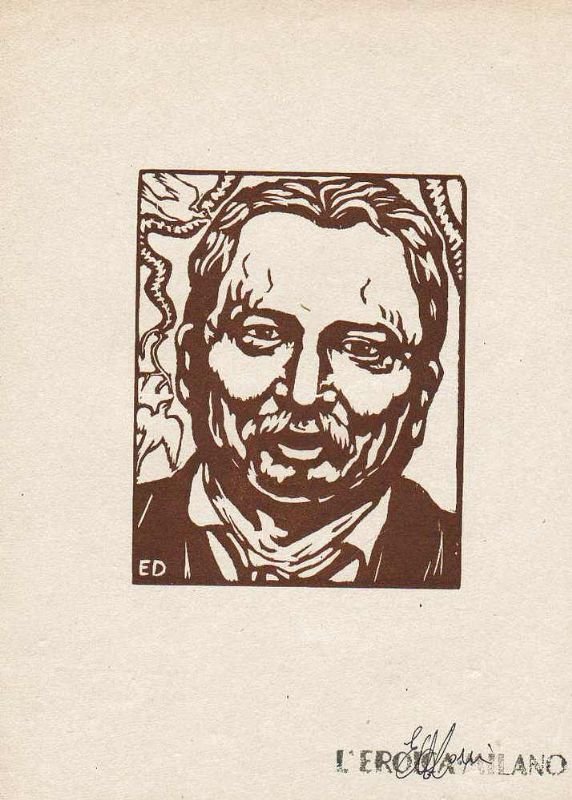Foglio di cm 30 x 22 circa; l'immagine è stampata in inchiostro marrone (cm 15 x 12). Prova di stampa della xilografia che andrà alla p. 4 del Quaderno 87-90 de L'Eroica, dedicato interamente a Giovanni Pascoli; al verso la dedicatoria al Poeta; nell'angolo in basso a destra timbro 'L'Eroica Milano' e firma del direttore della rivista, Ettore Cozzani. Ottimo stato di conservazione. Ercole DOGLIANI (Torino, 1888 - 1929) è stato un incisore italiano. Tenace e convinto artista del legno inciso, si specializzò nel ritratto. Artista autodidatta, fu dapprima fattorino e poi correttore di bozze presso il giornale torinese La Stampa, ma coltivava la sua passione per il disegno eseguendo poetiche vedute della sua città. Incoraggiato da Leonardo Bistolfi approfondì in particolare la xilografia, di cui fu uno dei maestri nel genere del ritratto. Espose la prima volta agli Amici dell'Arte di Torino nel 1921, alla Promotrice delle Belle Arti e alla Pro-Cultura. Allestì una sola personale, a Livorno, nel 1927. Condivise lo studio con Marcello Boglione, insegnante di Incisione all'Accademia Albertina di Torino e con lui , nel 1928, realizzò tavole dedicate alla Vecchia Torino.