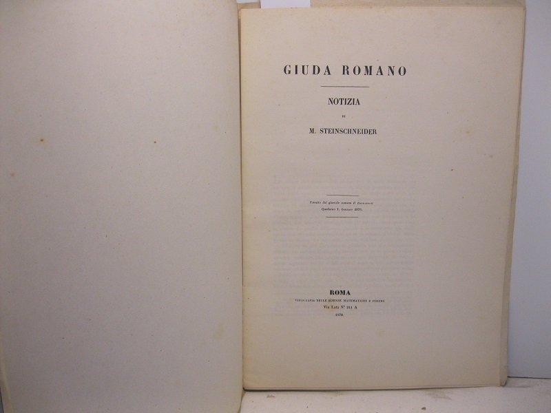 In 4, pp. 12. Br. muta coeva. Studio relativo agli Giudei di Roma. L'A. ritiene di dover rettificare l'idea degli storici medievali: 'facilmente si crede che l'esclusione dai diritti civili e politici, dal commercio sociale, dagli uffici scientifici, abbia avuto l'effetto, bensi' naturale, d'isolare i giudei nella scienza. Ma fortunatamente il desiderio scientifico, piu' che ogni vapore, si estende con forza intrinseca ed atterra i piu' saldi ostacoli che potrebbero erigerglisi contro. Ad illustrazione del nostro assunto servira' Giuda Romano, benche' tutto cio' che sappiamo di lui appena si stenda piu' in la' dei titoli delle sue opere.'.