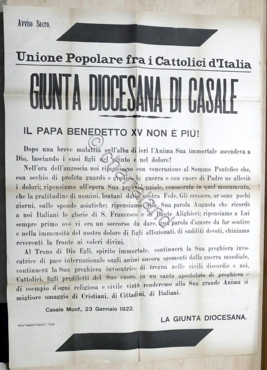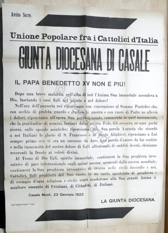 Giunta Diocesana di Casale Avviso Sacro - Morte di Papa Benedetto XV - datato Casale Monferrato 23 Gennaio 1922 Un foglio ripiegato, dimensioni: 64 x 88 cm ca. Lingua italiana. Buone condizioni.
