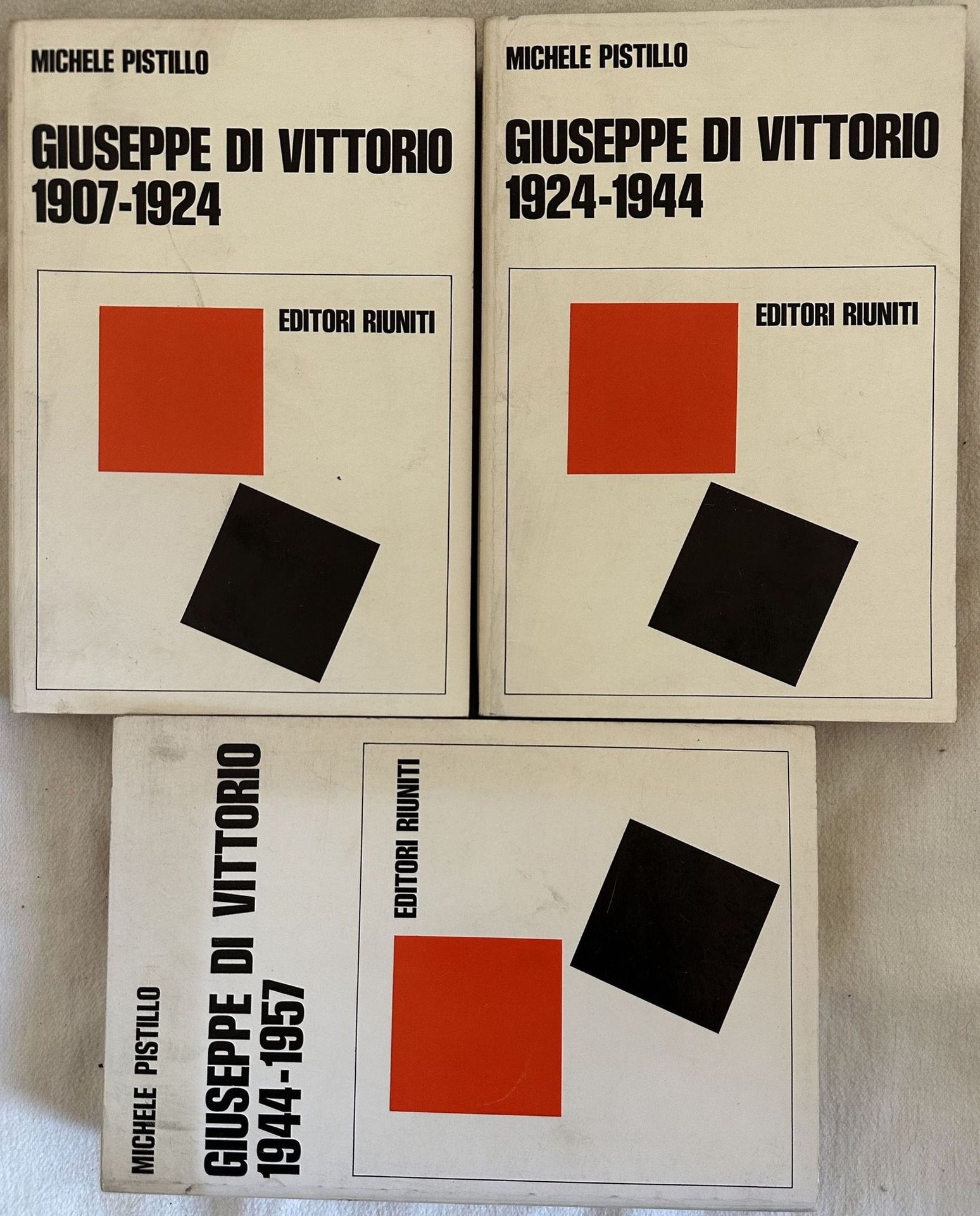Edizione del 1977 di questa monografia a cura di Michele Pistillo su Giuseppe di Vittorio (1892-1957) fondatore e segretario generale della CGIL, uno dei più importanti sindacalisti del secondo dopoguerra italiano. La raccolta è formata da tre volumi ed è completa. In ottime condizioni. Copertina editoriale in ottime condizioni generali con lievi usure ai margini e dorso. Legatura in ottime condizioni. All'interno le pagine si presentano in ottime condizioni con rare fioriture. In 8. Dim. 21,5x14,5 cm. Pp. 346+(2), 479+(1), 361+(7). Edition of 1977 of this monography by Michele Pistillo about Giuseppe di Vittorio (1892-1957) establisher and general segretarian of CGIL, one of the most important trade unionist of the second after war period. The collection is made up of three volumes and it is complete. In very good conditions. Editorial cover in very good good general conditions lightly worn in the extremities. Binding in very good conditions. Inside pages are in very good conditions with occasional foxing. In 8. Dim. 21,5x14,5 cm. Pp. 346+(2), 479+(1), 361+(7).
