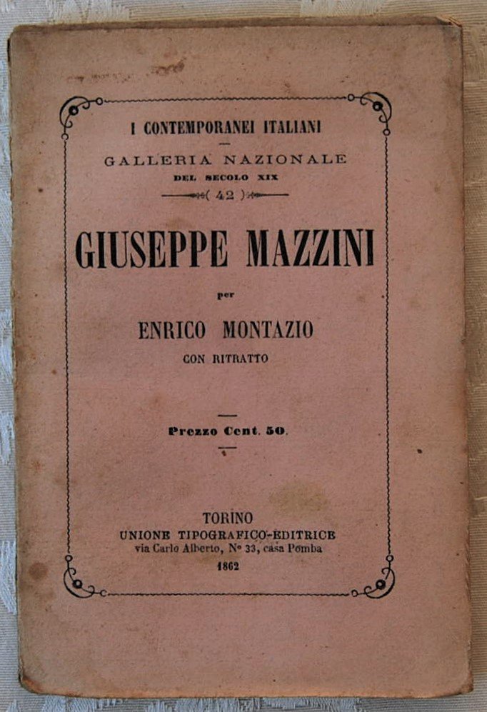 Unione Tipografica Editrice, 1862. In-16, brossura, pp. 96, una tavola con ritratto del Mazzini all'antiporta. Collana: Contemporanei italiani numero 42. Macchia al piatto frontale e alla tavola, peraltro in buono stato.
