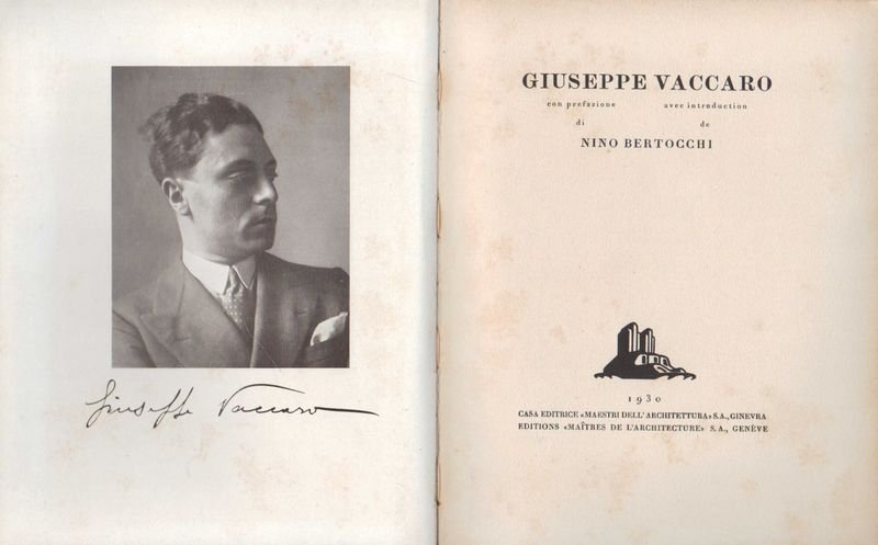 In-8°, legatura editoriale in tutta tela verde con titoli in oro, pp. XXI(3) di testo e 65(3) di illustrazioni in nero, su carta patinata. Alla prima pagina dedica autografa firmata di Giuseppe Vaccaro a Costanzo Ciano. Testo in italiano e francese. Giuseppe VACCARO (Bologna, 1896 - Roma, 1970) è stato un architetto italiano. Terminati gli studi classici, nel 1916 si diploma con il massimo dei voti come professore di disegno architettonico presso il Regio Istituto delle Belle Arti di Bologna. Integra gli studi presso la Regia Scuola d'applicazione per Ingegneri laureandosi all'età di 24 anni in architettura con il massimo dei voti. Fu prima assistente di Attilio Muggia (1920/21), titolare della cattedra di Architettura Tecnica, e successivamente titolare della cattedra nella stessa materia (1934) presso la Regia Università di Roma. Tra le sue opere si segnala la Cappella Goldoni, monumento funebre del 1942 in stile modernista con bassorilievo del Giudizio Universale di Amerigo Tot, considerata una delle opere di pregio artistico della Certosa di Bologna. Tela scolorita al dorso, e nelle zone adiacenti; per il resto ottimo esemplare, arricchito dalla dedica.