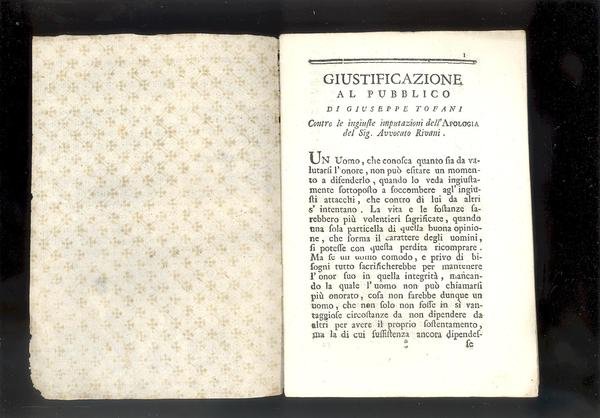 IN 8°, pp:10, COPERTINA A LOSANGHE TIPO REMONDINI D' EPOCA.<BR>CAUSA PER STAMPA - GIORGI, TOFANI. PLACCHETTA CON LA GIUSTIFICAZIONE AL PUBBLICO DI GIUSEPPE TOFANI CONTRO LE INGIUSTE IMPUTAZIONI DELL'APOLOGIA DEL SIG. AVVOCATO RIVANI. OTTIMA CONSERVAZIONE. ID 2110