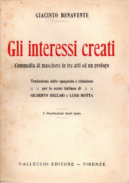 Gli interessi creati. Commedia di maschere in tre atti ed un prologo, pp. 121, formato 14 x 19,5.<BR>Copertina morbida di colore crema con titoli in nero e rosso al piatto anteriore e in nero sul dorso. Presenti 5 illustrazioni fuori testo. Traduzione dallo spagnolo di Gilberto Beccari e Luigi motta. Volume intonso. <BR>Leggere fioriture ai piatti. Dorso leggermente brunito. Nel complesso condizioni molto buone.