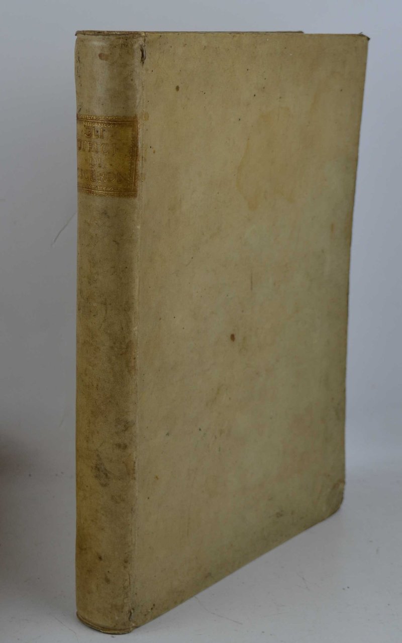 Cm. 36,5, pp. x (2), 348. Bell'antiporta illustrata, frontespizio in rosso e nero, vignette, capolettera e finalini elegantemente incisi in rame. Leg. strettamente coeva in piena pergamena rigida con titoli in oro al dorso. Esemplare particolarmente marginoso e fresco, in eccellente stato di conservazione. Edizione di gran pregio degli Uffici ciceroniani impreziosita da copiosi ed interessanti commentari filosofico-giuridici. Cfr. Gamba, 2196.