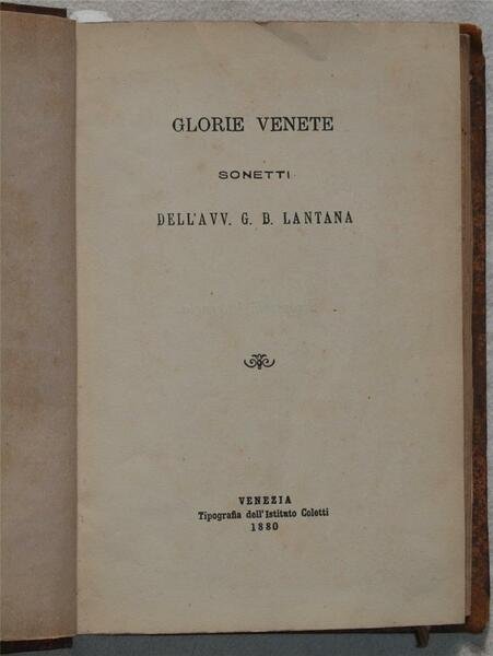 In 16. Dim. 18,5x12,5 cm. Pp. 178, 158+(2). Rara raccolta di due opere legate insieme in un unico volume. La prima del 1880 sono una serie di sonetti di glorie venete scritte da Giambattista Lantana. I sonetti descrivono episodi storici e personaggi famosi (origine di Venezia, Paolo Anafesto I Doge, traslazione delle reliquie di San Marco, Domenico Michiel, Enrico Dandolo, Jacopo Tiepolo Doge, Aldo Manuzio, Lepanto, Antonio Foscarini, i Murazzi di Venezia ecc.). La seconda opera è la rara prima edizione dell'opera "La vita militare bozzetti" di Edmondo de Amicis (1846-1908). Nel 1865 De Amicis era cadetto alla Scuola militare di Modena. Spostatosi a Firenze iniziò a scrivere i bozzetti che pubblicò nella "Nuova Antologia" e "Italia militare". L'autore cerca di dare una buona impressione dell'esercito italiano. Entrambe le opere sono state collazionate. In buone condizioni. Copertina in mezza pelle in buone condizioni generali con lievi usure ai margini e dorso. Legatura in buone condizioni con una lieve rottura al frontespizio della seconda opera. All'interno le pagine si presentano in buone condizioni con fioriture. Angolo inferiore destro dell'occhietto della seconda opera in parte staccato. Piccola macchia a pag. 53 della seconda opera che non inficia il testo. Mende. Scarce collection of two works bound together in a unique volume. The first one of 1880 are a series of sonnets of glories of Veneto written by Giambattista Lantana. The sonnets describe historical happenings and famous carachters (origin of Venice, Paolo Anafesto I Doge, traslation of relics of San Marco, Domenico Michiel, Enrico Dandolo, Jacopo Tiepolo Doge, Aldo Manuzio, Lepanto, Antonio Foscarini, i Murazzi di Venezia etc.). The second work is the scarce first edition of "La vita militare bozzetti" by Edmondo de Amicis (1846-1908). In 1865 De Amicis was cadet in the military school of Modena. Moved in Florence De Amicis began to write his works published in "Nuova Antologia" and "Italia militare". The author tries to give a good impression of the italian army. Both works have been collationed. In good conditions. Half leather cover in good general conditions slightly worn in the edges and discoloured spine. Binding in good conditions with a slight crack in the title page of the second work. Inside pages are in good conditions with foxings. Usage signs. Right lower corner of the firts title page is partially detached. Little stain in page 53 with no loss of text.