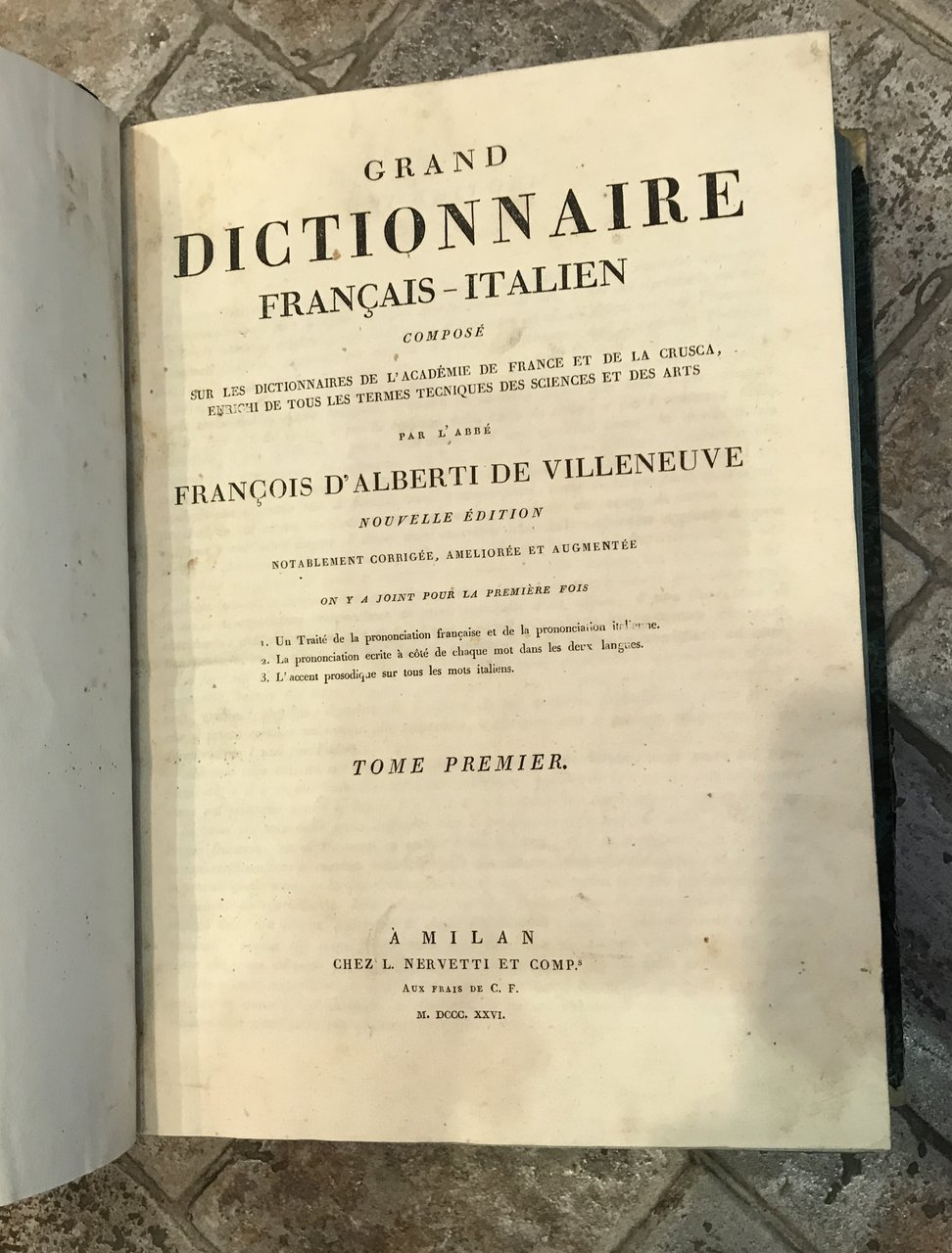 Grand Dictionnaire Français-Italien composé sur les dictionnaires de l'Académie de France et de la Crusca, enrichi de tous les termes tecniques des sciences et des arts. Nouvelle édition notablement corrigée, ameliorée et augmentée on y a joint pour la première fois 1- un traité de la prononciation française et de la prononciation ; 2 - La prononciation ecrite à coté de chaque mot dans les deux langues; 3- L'accent prosodique sur les mots italiens
