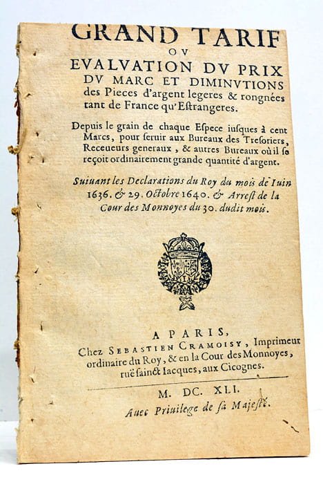 GRAND TARIF ou Evaluation du Prix du Marc et Diminutions des Pièces d'argent légères et rognées tant de France qu'Estrangères. Depuis le grain de chaque Espèce jusques à cent Marcs, pour servir aux Bureaux des Trésoriers, Receveurs Généraux et autres Bureau où il se reçoit ordinairement grande quantité d'argent.