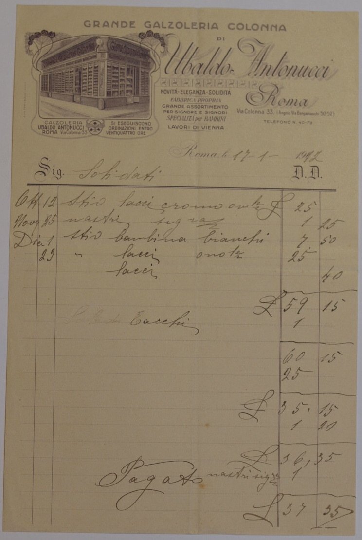 Bella fattura del 17 gennaio 1912 della "Grande calzoleria Colonna" di Roma. Lista del materiale acquistato (diverse paia di scarpe con lacci, tacco e da bambina) con i prezzi. Bella intestazione con veduta del negozio In buone condizioni, piegature Dim. cm 22x14,5. Beautiful invoice of the 17th of january 1912 of the shop "Grande calzoleria Colonna" di Roma. List of material and price (different kind of shoes). Beautiful graphic with a view of the shop In good conditions, foldings.