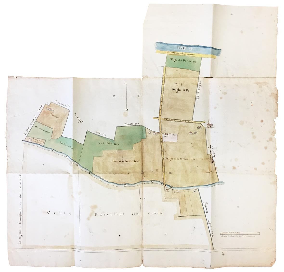 Grande carta catastale o cabreo di un'area nel territorio di Ferrara posta appena sotto il Po dal quale la divide l'«arzere novo di Contarini» e il taglio del Po Vecchio. Mentre a sud è delimitata dal Canal Bianco ferrarese.