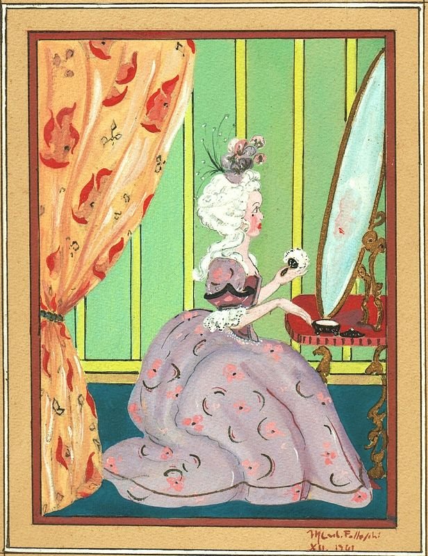 Graziosa raffigurazione di dama allo specchio mentre si incipria.
