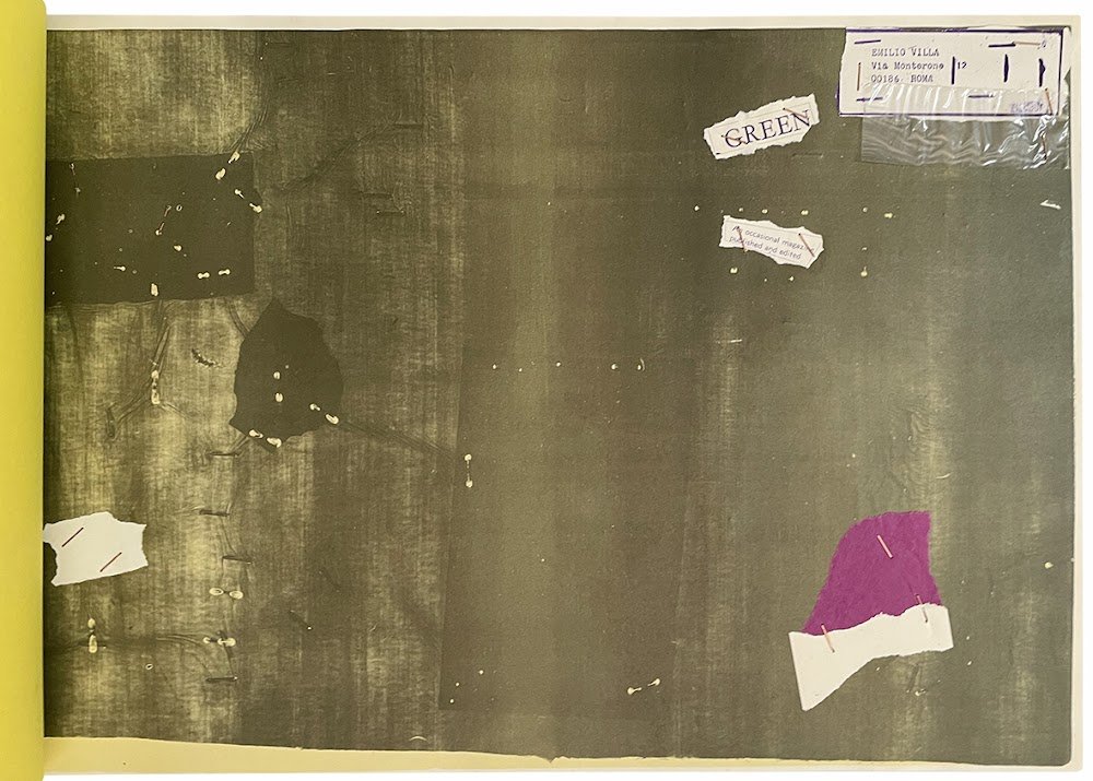 Mm. 343x496. Pp. [18] in gran parte illustrate. Libro d'artista, ogni tavola riproduce a stampa lo stesso o un analogo soggetto, virato e variamente distorto, su cui l'autore pinza frammenti di carte diverse (cartone, carta igenica, carte con diverse scritte e contrassegni) all'insegna di uno straniante 'collage a punto metallico'. Brossura originale illustrata a nove punti metallici con copertina composita: piatto anteriore in carta gialla con design b/n dell'autore e piatto posteriore in cartone spesso con pinzato un foglietto arancione di colophon in quarta di copertina . Ottima copia di questa prima ed unica edizione originale in tiratura limitata di 120 esemplari. Ns copia, come tutti gli esemplari, è numerata «1» e «perciò ogni copia è da intendersi unica» (dal colophon).