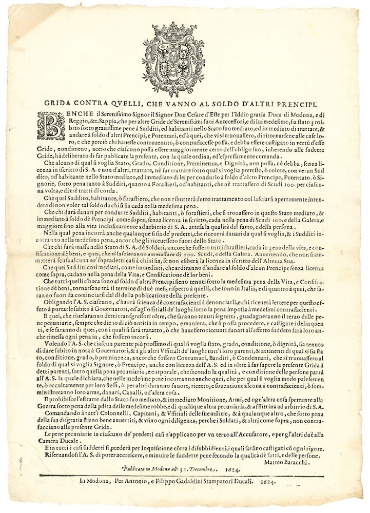 Mm. 420x300. Manifesto con stemma estense e capolettera in stampa xilografica. Traccia di piegatura centrale.Interessante grida con la quale Cesare d'Este, Duca di Modena e Reggio, conferma ed inasprisce le pene previste per quanti avessero osato "...trattare, & andare à soldo d'altri Prencipi, e Potentati...".