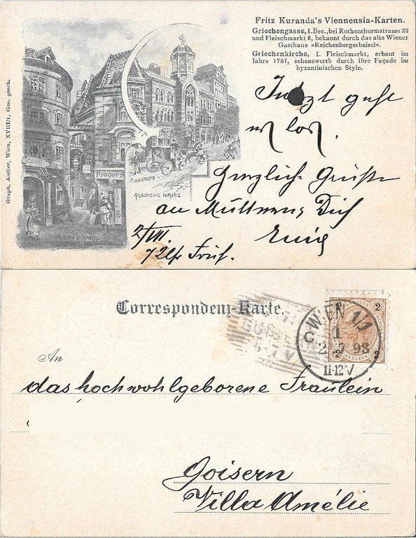 Griechengasse, Griechenkirche. Fritz Kuranda's Viennensia-Karten. Viaggiata 1898