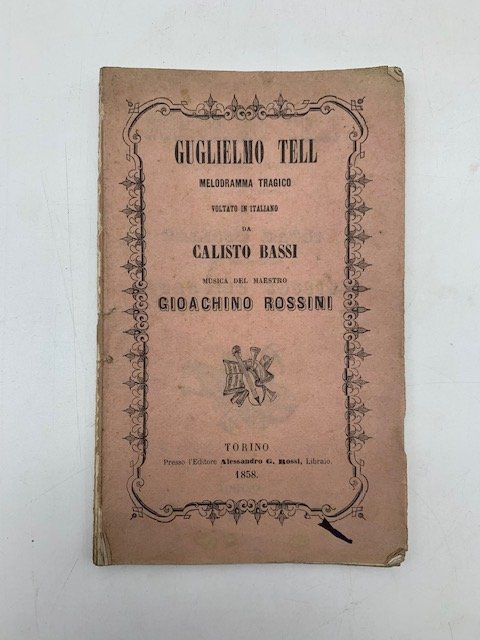 In 16 (cm 10 x 16), pp. 39 + (1). Brossura editoriale. Libretto del melodramma Guglielmo Tell, tradotto in italiano da Calisto Bassi e musicato da Gioacchino Rossini, la cui prima fu a Lucca nel 1831.