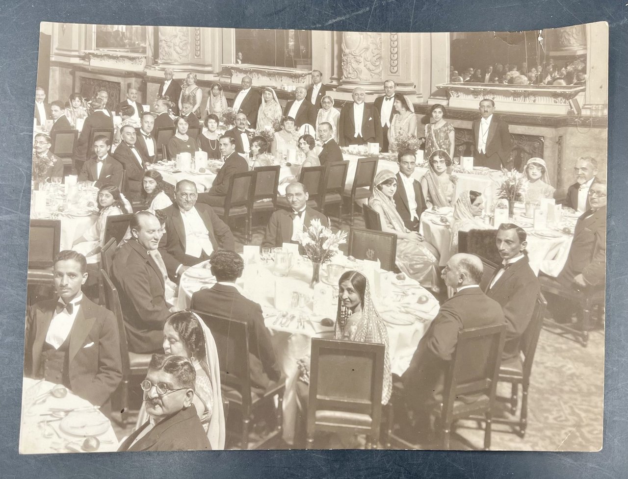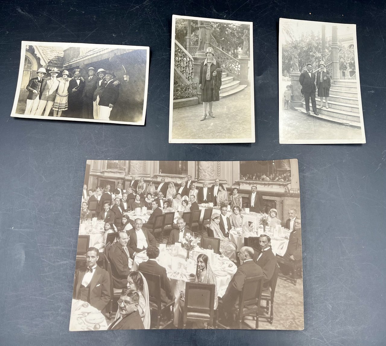 Foto in cartoncino leggero, tonalità seppia, MARCONI (Bologna 1874-Roma 1937). nel 1905 sposò Beatrice O'Brien, nel 1927 il matrimonio fu annullato e sposò la contessa romana Bezzi-Scali. Qui si trova davanti a un bungalow coloniale, probabilmente a Bombay, (durante una crociera del 1929, o durante il viaggio trionfale intorno al mondo 1933-34?). Timidamente sorridente, in elegante spezzato, cappello chiaro. Le altre persone sono: un giovane con casco che tiene il braccio sinistro al collo del Marconi, una signora con cappello a cloche, che tiene le braccia attorno al collo del Marconi e di un altro signore (il marito, certo Costanzo S.?) e altri tre signori, due con casco coloniale. UNITE: due foto-cartolina postale Gevaert coeve, una datata sul retro Port Said 29/5 1929-VII, firmata Costanzo S. e indirizzata a Bianca Webb, con la foto dei due coniugi che appaiono nella foto precedente accanto a Marconi; l'altra con la sola signora; scattate davanti a una villa (napoletana?). Inoltre una scenografica grande vera FOTO seppia grande foto di cm. 21,4x16 con ol gremito salone ristorante (in cui non distinguiamo Marconi, ma tratta sempre dallo stesso album. Questa foto si trovava (con un'altra foto di gruppo, che non abbiamo più, soprafirmata da Marconi, il quale vi appariva inghirlandato) in un album di famiglia presumibilmente di Bianca Webb. La vera foto con il lotto
