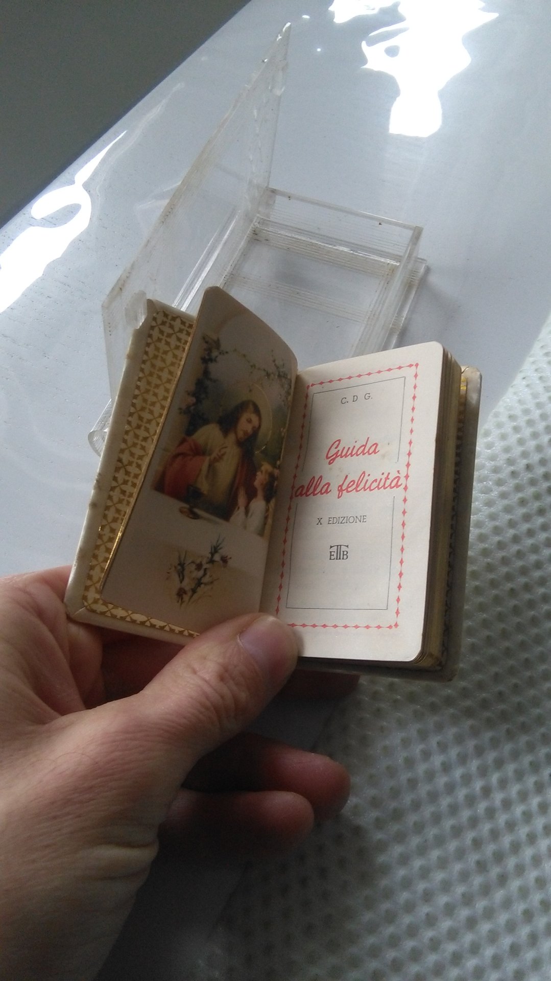 Piccolo libretto rilegato con sua scatoletta di plastica.