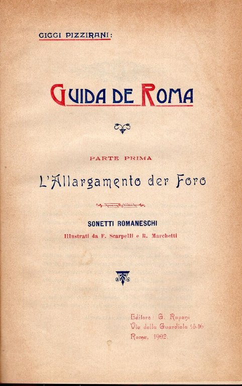 Guida de Roma. Parte prima L'allargamento der Foro. Sonetti romaneschi. Illustrati da F. Scarpelli e R. Marchetti. Unito insieme a: Turchi Augusto, Novelle umoristiche, letture per la gioventù, pp. 126, Roma, Desclee, Lefebvre e C., 1902.