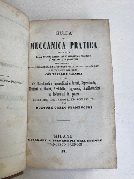 Guida di meccanica pratica. Ad uso dei macchinsti, imprenditori di lavori, soprastanti, direttori di filatoi, architetti, ingegneri, manifatturieri, ed industriali in genere.