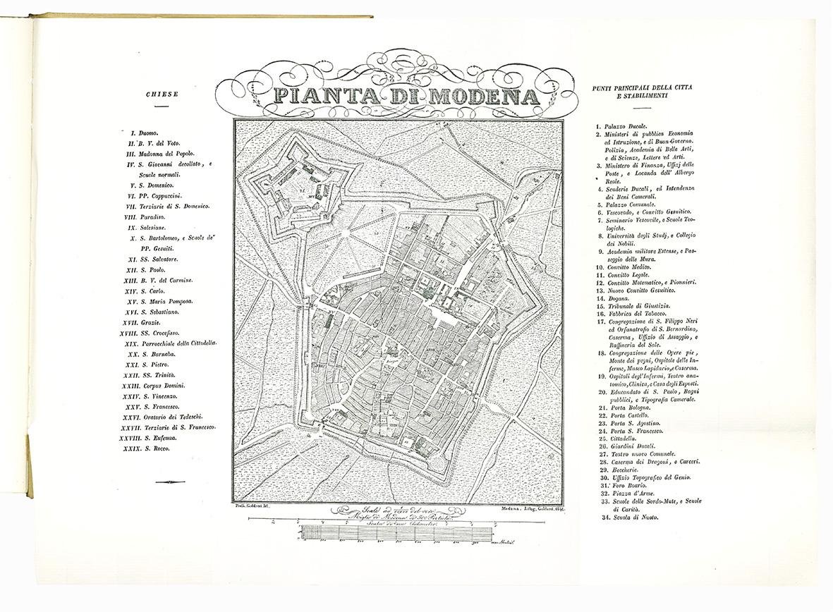 In 8vo (mm 250x178); pp. [6], 207, [3], [1] c. di tav. più volte ripiegata fuori testo. Brossura editoriale con sovraccoperta illustrata. Fa parte della collana "Deputazione di storia Patria per le Antiche Provincie Modenesi. Biblioteca - Nuova Serie N. 18. Edizione numerata di 500 esemplari (copia n. 94), riproduzione facsimile dell'edizione pubblicata a Modena dalla Tipografia Camerale nel 1841. Ottimo esemplare.