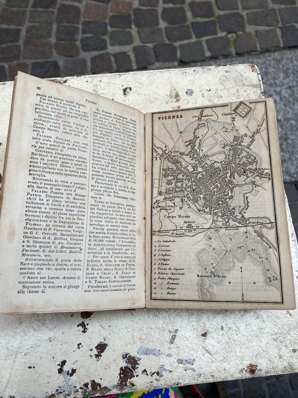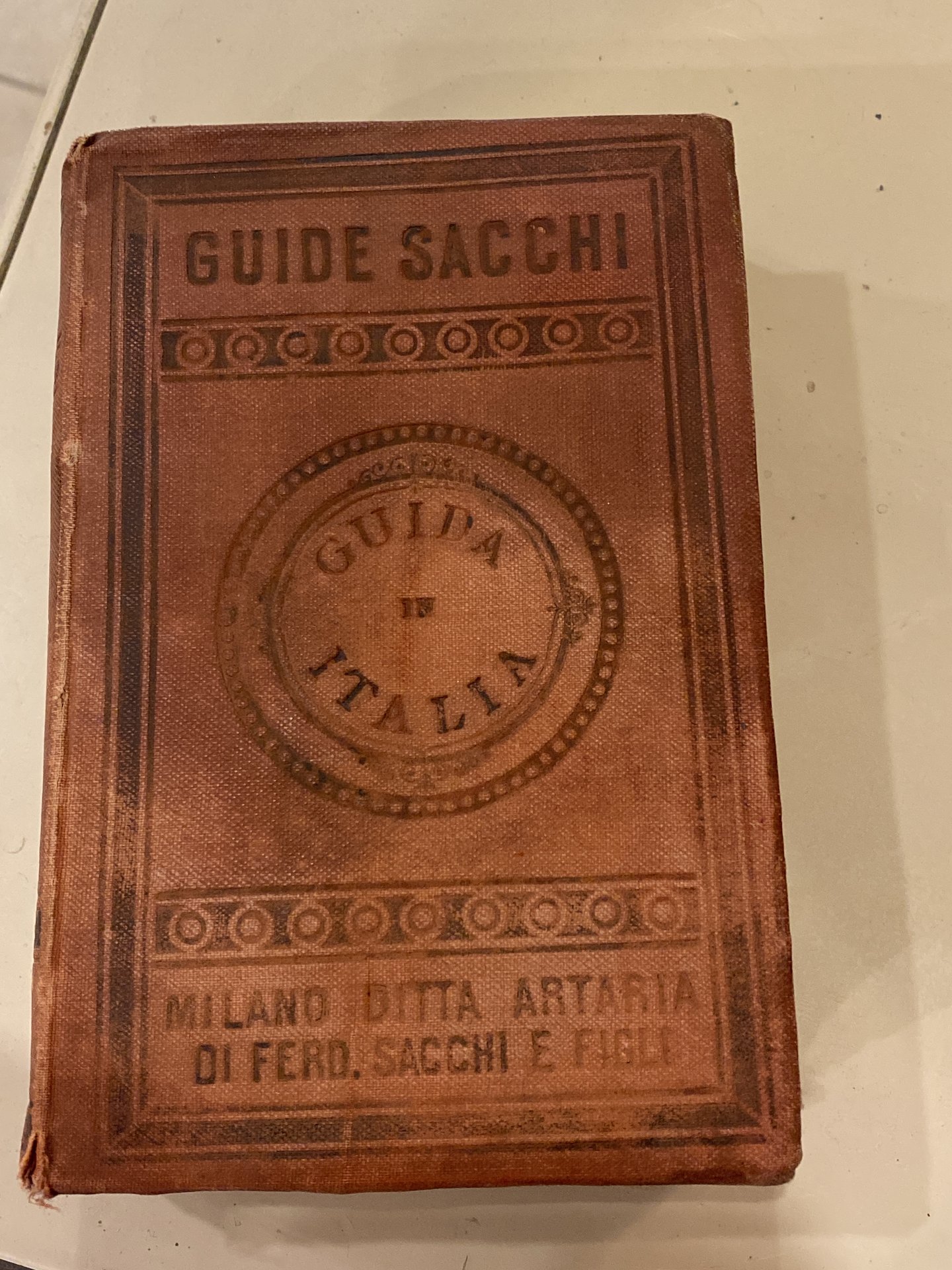 Vol. unico, in -16, pp. XVI+446, pubblicità finali, n. 4 carte geografiche (una grande dell'Italia) ripiegata più volte e contenuta in una tasca in fondo al libro, n. 22 piante topografiche incise all'inizio di ogni città alcune di due pagine, si trovano escurisoni, curiosità dei vari luoghi, opere d'arte, monumenti. Legatura in tutta tela color mattone con titoli in nero legg. screpolata.
