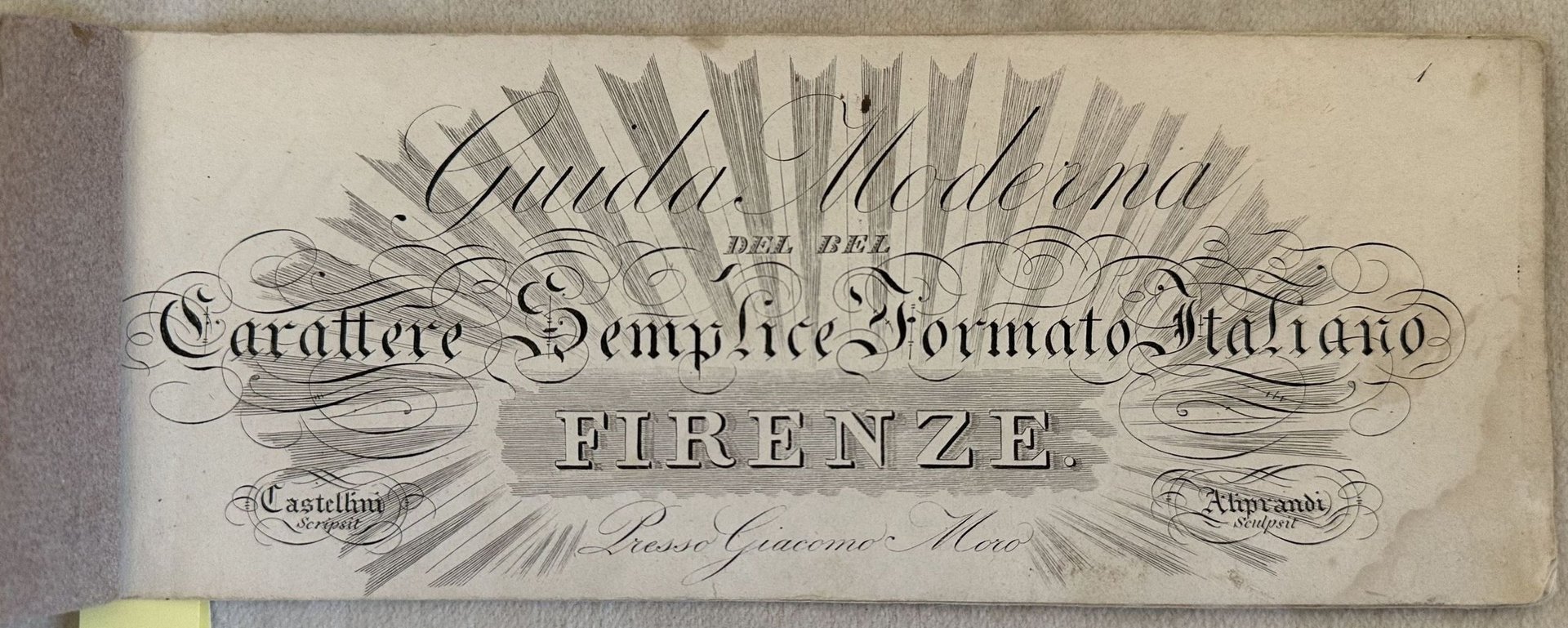 Manuale di calligrafia del 1840 circa edito da Giacomo Moro. L'opera è formata da 12 tavole incise da Aliprandi su soggetto di Castellini. In buone condizioni. Copertina editoriale in buone condizioni con lievi usure ai margini e dorso. Legatura in buone condizioni. Pagine in buone condizioni con rare fioriture. In 8. cm 9,5x24,5. Pp. 12.Manual of calligraphy of 1840 circa edited by Giacomo Moro. The work is made up of 12 plates engraved by Aliprandi after Castellini. In good conditions Editorial cover in good conditions lightly worn in the extremities. Binding in good conditions. Pages in good conditions with occasional foxing. In 8. cm 9,5x24,5. Pp. 12.