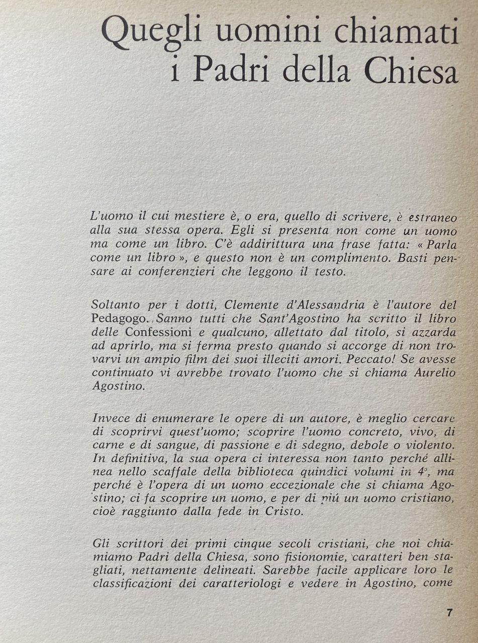 Di questa storia, apostoli e martiri, Ignazio, Giustino, Ireneo, Cipriano, hanno segnato col loro sangue le prime pagine. I Padri, dietro a loro, sono i testimoni, le pietre vive della Chiesa che si costruisce: commentano la Scrittura, difendono la fede contro le eresie nascenti, gettano le basi di una liturgia; l'Oriente fornisce i filosofi, l'Occidente i rétori e i giuristi, Nel IV secolo, questa elaborazione raggiunge la sua piena maturità: è l'età d'oro della cultura cristiana antica; tutte le forme letterarie vi sono splendidamente rappresentate. Ciò che stupisce il lettore di oggi, nei Padri della Chiesa, è la loro prestanza umana, ma anche la loro diversità. I loro scritti ce li mostrano. di carne e sangue, vicini ai problemi del loro tempo, attenti a Dio e agli uomini. Il ritorno ai Padri è indispensabile all'approfondimento religioso, che è un segno del cristianesimo contemporaneo. Non ci possono dare le nostre soluzioni, ma ci aiutano a riflettere. In questo, il rinnovamento patristico è inscindibile dal movimento biblico, dalla riforma liturgica, dalla nuova ricerca teologica. Ci mancava una presentazione d'insieme dei Padri della Chiesa.