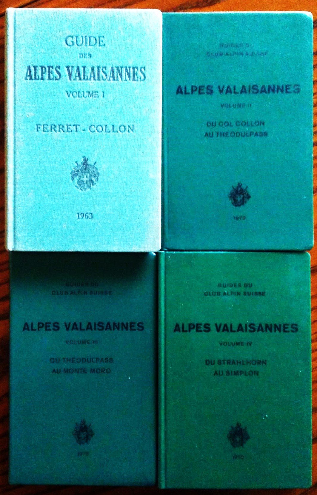 Zurich, Club Alpin Suisse, 1963 - 1970. 16°, quattro volumi, legature editoriali. Volume I - (Du col Ferret au Col Collon), pp.516, 73 illustrazioni; Volume II - Du Col Collon au Theodulpass, pp. 356, 45 disegni e 16 fotografie; Volume III - Du Theodulpass au Monte Moro, pp. 236, 30 disegni e 12 fotografie; Volume IV - Du Strahlhorn au Simplon, pp. 355, 53 disegni e 16 fotografie. Ottime copie.