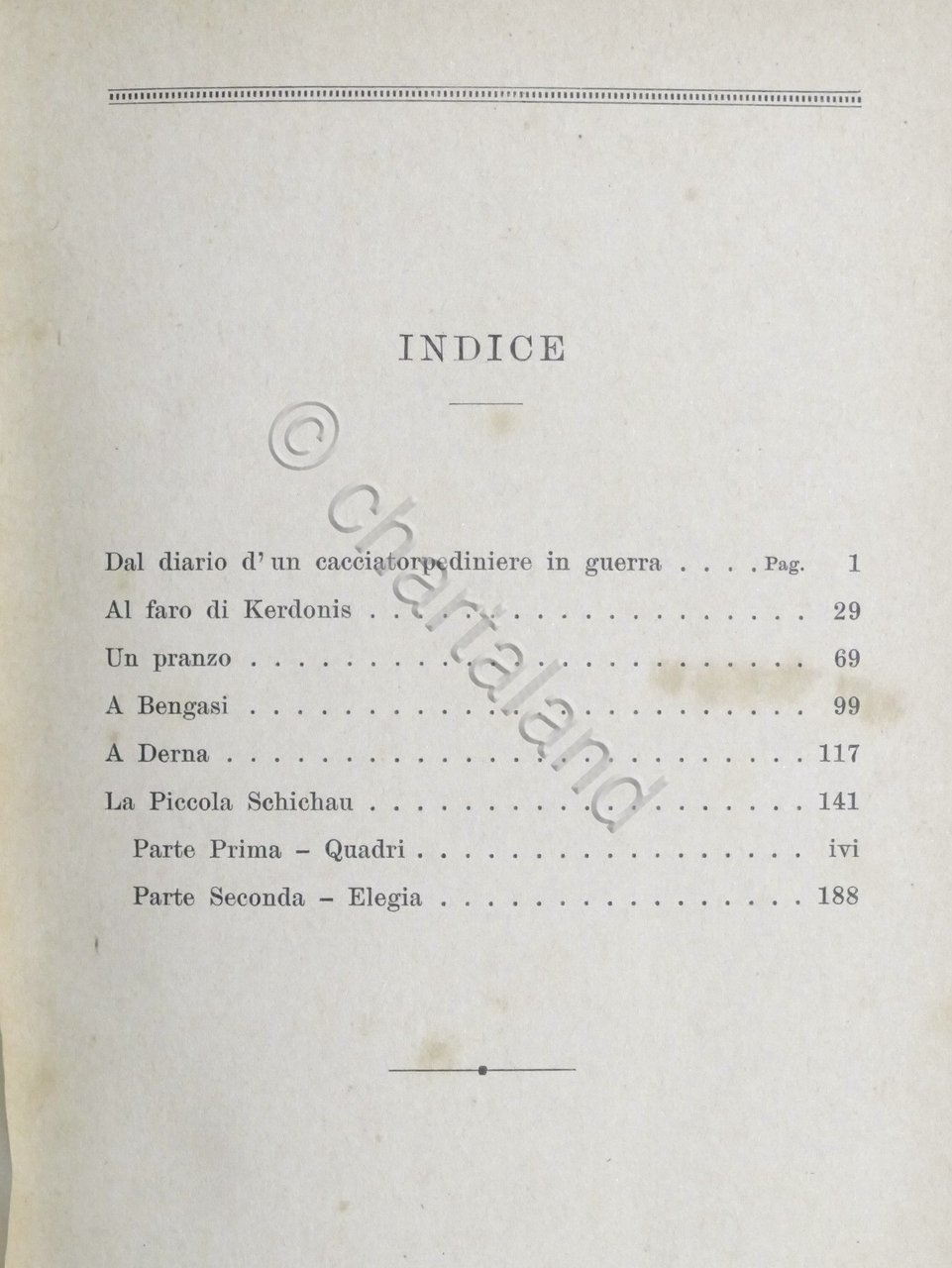 Contiene: Dal diario d'un cacciatorpediniere in guerra, Al faro di Kerdonis, Un pranzo, A Bengasi, A derna, La piccola Schichau.
