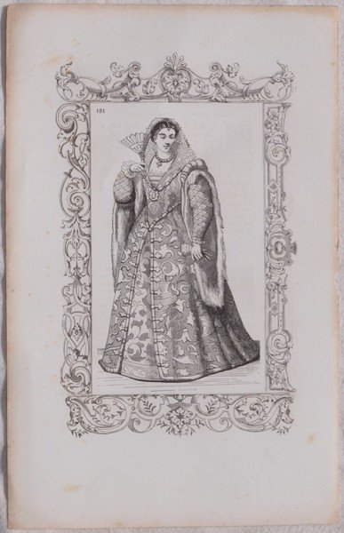 Deliziosa tavola xilografica proveniente dall'edizione ottocentesca della nota opera del 1590 "Habiti antichi et moderni di tutto il mondo di Cesare Vecellio". Le tavole, disegnate dal Vecellio sono riproduzioni dell'edizione cinquecentesca dell'opera. Lo scritto, fondamentale per lo studio sul costume ed abbigliamento di ogni genere e luogo, è universalmente celebrato come la più antica enciclopedia sui costumi. La tavola è impreziosita da testo esplicativo contenente notizie e curiosità. INCISIONE: xilografia AUTORE: Cesare Vecellio DIMENSIONI PASSEPARTOUT: cm 23x14,50 DIMENSIONI INCISIONE: cm 16x10,5 EPOCA: 1859 CONDIZIONI: buone condizioni, usure al margine sinsitro, rare fioriture Al verso della tavola presente testo esplicativo che non corrisponde alla planche in questione. Viene fornita copia anastatica della corretta spiegazione della tavola Testo italiano e francese. Nice woodcut coming from the edition of the XIX century of the famous work of 1590 "Habiti antichi et moderni di tutto il mondo di Cesare Vecellio". The planches, drawn by Vecellio are reproduction of the XVI century edition of the work. The writing, important work about the costume and appearel of each kind and place, is universally celebrated as the most ancient aencyclopedia about costumes. The planche is enriched by explicative text containing curiosities and information. ENGRAVING: xilography AUTHOR: Cesare Vecellio PASSE-PARTOUT DIMENSION: cm 23x14,50 ENGRAVING DIMENSION: cm 16x10,50 DATE: 1859 CONDITIONS: good; wearings in the left edge and occasional foxings In the verso of the planche there is the explicative text not corresponding to this planche. We provide anastatic copy of the correct explanation. Italian and french text.
