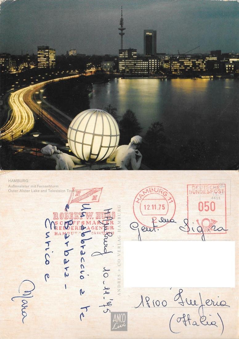 Hamburg. Aussenalster mit Fernsehturm. Viaggiata 1975