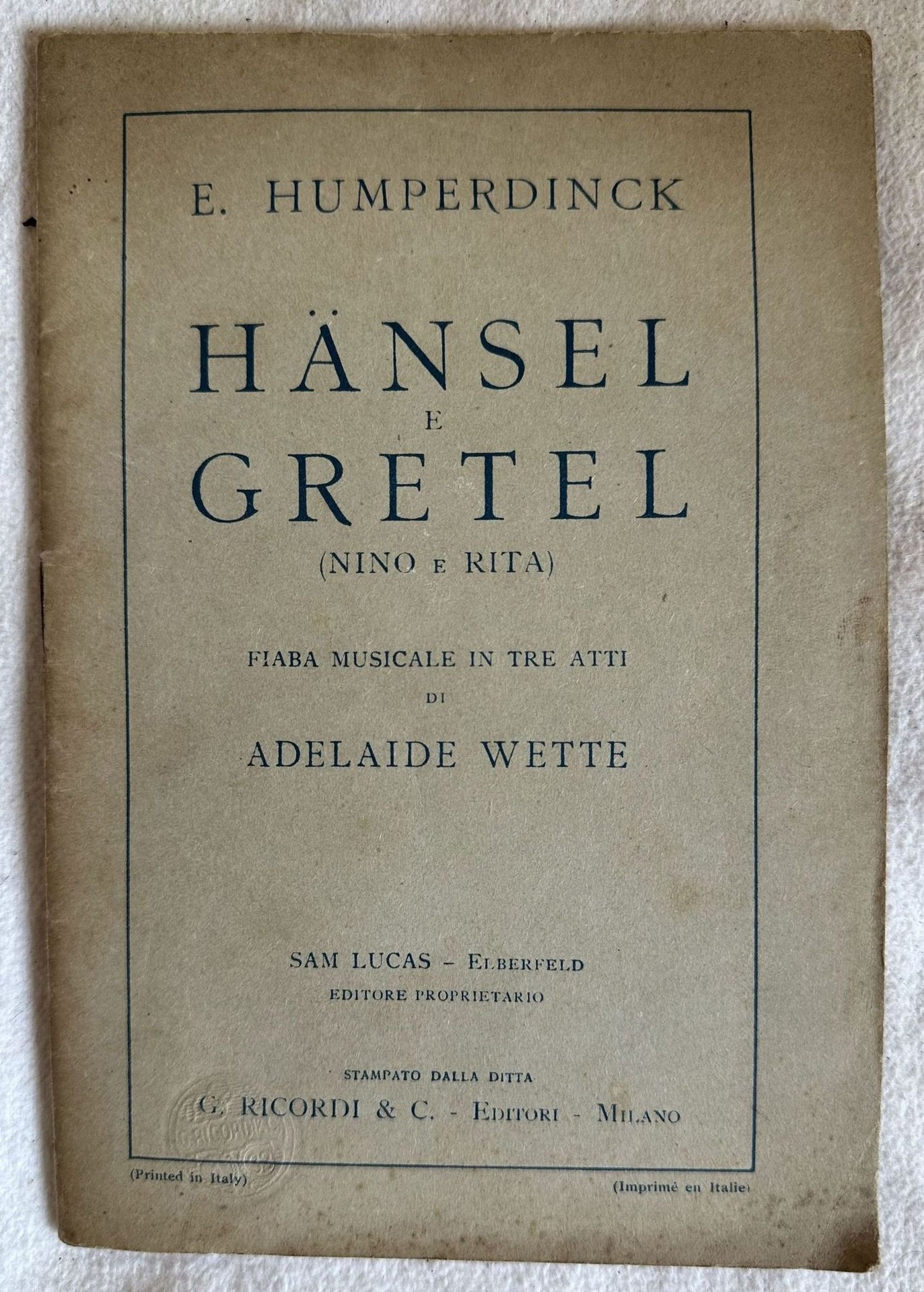 Edizione Ricordi del gennaio 1933 di questo libretto d'opera dell'opera "Hansel e Gretel" del compositore tedesco Engelbert Humperdinck (1854-1921). L'opera venne rappresentata per la prima volta nel 1893. Timbro a secco Ricordi datato gennaio 1933. Al frontespizio nota manoscritta con data della rappresentazione per la quale è stato utilizzato il libretto "Scala 23/1/60" diretta da Votto e indicazione manoscritta degli attori (Fioravanti, Canali, Cassotto, Scotto, Nicolai). Versione ritmica di Gustavo Macchi. In buone condizioni Brossura editoriale in buone condizioni generali con usure ai margini e dorso. Legatura in buone condizioni. All'interno le pagine si presentano in buone condizioni con rare fioriture. In 8. cm 20x13,5. Pp. 40.Ricordi edition of january 1933 of this booklet of the opera "Hansel e Gretel" by the german composer Engelbert Humperdinck (1854-1921). The work was represented for the first time in 1893. Embossed stamp dated january 1933. In the title page indication of theatre and date of representation "Scala 23/1/60" directed by Votto and handwritten indication of actors (Fioravanti, Canali, Cassotto, Scotto, Nicolai). Rythmic version by Gustavo Macchi. In good conditions. Editorial cover in good general conditions lightly worn in the edges and spine. Binding in good conditions. Inside pages are in good conditions with occasional foxings.In 8. cm 20x13,5. Pp. 40.