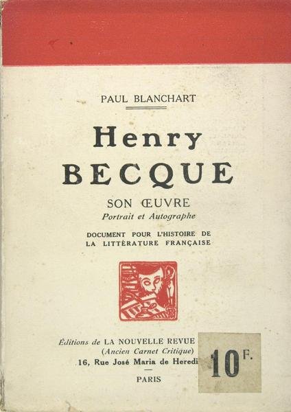 Edition de la nouvelle revue, Paris, 1930. Petit in/8 broché, frontispice et autographe, 126 pages. Petit manque de papier en couverture. Henry-François Becque, dit Henry Becque, né à Paris le 28 avril 1837 et mort à Paris le 12 avril 1899, est un dramaturge français, connu surtout pour une comédie, La Parisienne, et un drame réaliste grinçant, Les Corbeaux.