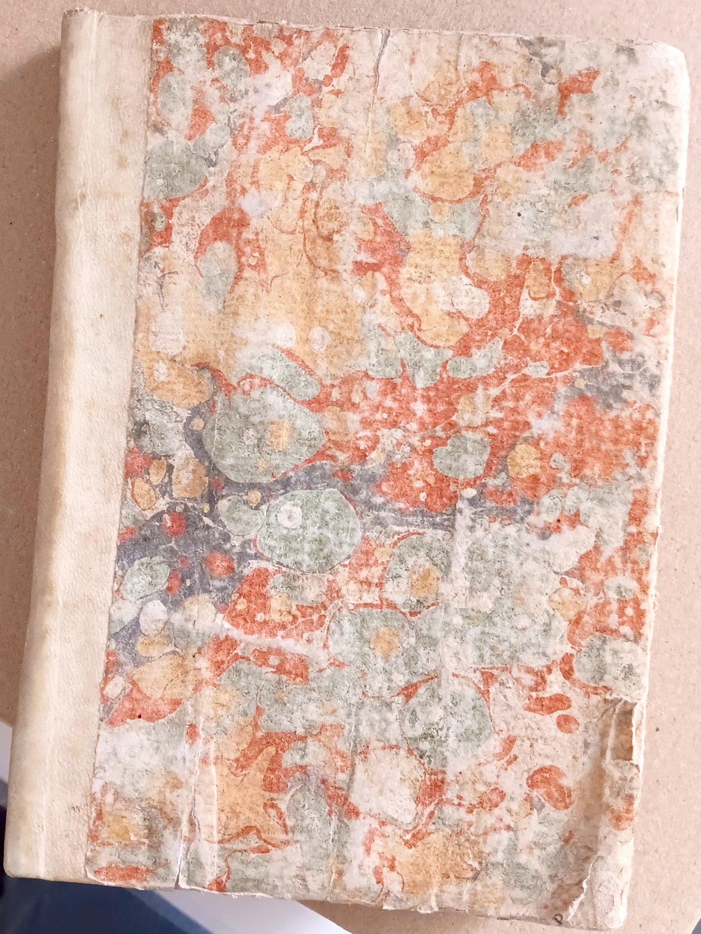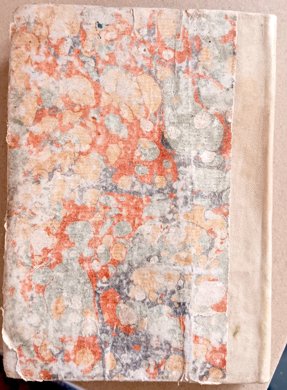 In 8°, pp. 222, marca editoriale al frontespizio e al verso dell’ultima carta. Mezza pergamena e carta marmorizzata, tagli spruzzati, scarso margine superiore.