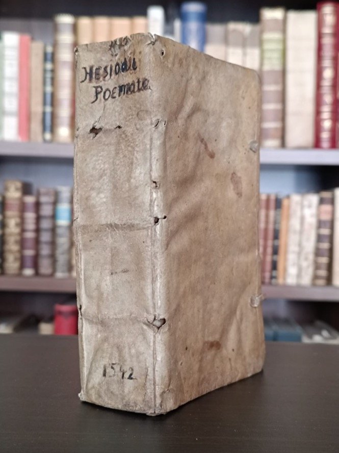 <span style="font-style: normal;">2 parti in 1 volume in-8° (cm. 16,8), legatura coeva in piena pergamena con titolo sovrascritto al dorso (disgiunta e con alcune tracce d'uso, ma genuina); pp. [8] 373 [3], 270 [26] in buono stato, con qualche capolettera (alcune gore marginali alle prime e ultime carte, lievi e sporadiche fioriture, trascurabili forellini di tarlo al solo margine superiore di alcune carte di mezzo senza fastidio). Edizione per nulla comune delle opere di Esiodo, nella prima parte proposte in latino con testo greco a fronte; prefazione di Johann Birckmann datata 1542 e versi in fine dell'umanista Pylades Brixianus, al secolo Giovanni Francesco Boccardo. </span>La<span style="font-style: normal;"> seconda parte consiste in Scholia Greeca attribuiti al filologo bizantino Johannes Tzetzes, </span><i>Ioannou Grammatikou tou Tzetzou Ex?g?sis t?n bibl?n tou Hesiodou, T?n erg?n kai hemer?n. T?s aspidos tou Herakleous. T?s theogonias</i> [cfr.<span style="font-style: normal;"> Pietrosanti, </span><i>Leggere Esiodo a Bisanzio. I commenti di Tzetzes e di Pediasimo allo Scudo di Eracle nelle scuole dell’impero</i><span style="font-style: normal;">, in </span><i>Quaderni del Cairoli</i><span style="font-style: normal;">, 36 (2022), pp. 225-251. </span>Dedica a Cuthbert Tunstall, vescovo di Durham sotto Maria I ed Elisabetta I, ma anche umanista e uomo politico. <span style="font-style: normal;"><span style="font-size: 13.333333px;">Per l'editore cfr. </span>VD16, H2680</span>. Antiche firme di appartenenza ai risguardi e sporadiche note antiche in greco ai margini. Esemplare più che discreto.