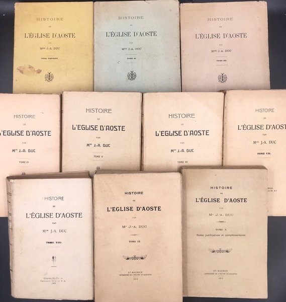 Opera completa in 10 voll. in-8° (cm. 20 x 13 cm). (4), VIII, 392; VIII, 464; 512; 524, (2), 18; 448; 512; 524; 600; 482; 240 pp. Nelle loro brossure originali, genuini, ben cuciti, ottimi gli interni, qualche difettino a qualche dorso. Il 10° e ultimo vol. reca le "notes justificatives et complémentaires". Monumentale opera del DUC, vescovo di Aosta dal 1872 al 1907 "le plus éminent du XIXe siècle et l'un des prélats les plus qualifiés de l'épiscopat cisalpin" A. P. Frutaz, preziosa anche per la storia civile e per la toponomastica (riferisce nella loro esatta grafia, i nomi di tutte le località valdostane). Opera di riferimento, rarissima in questa sua edizione originale.