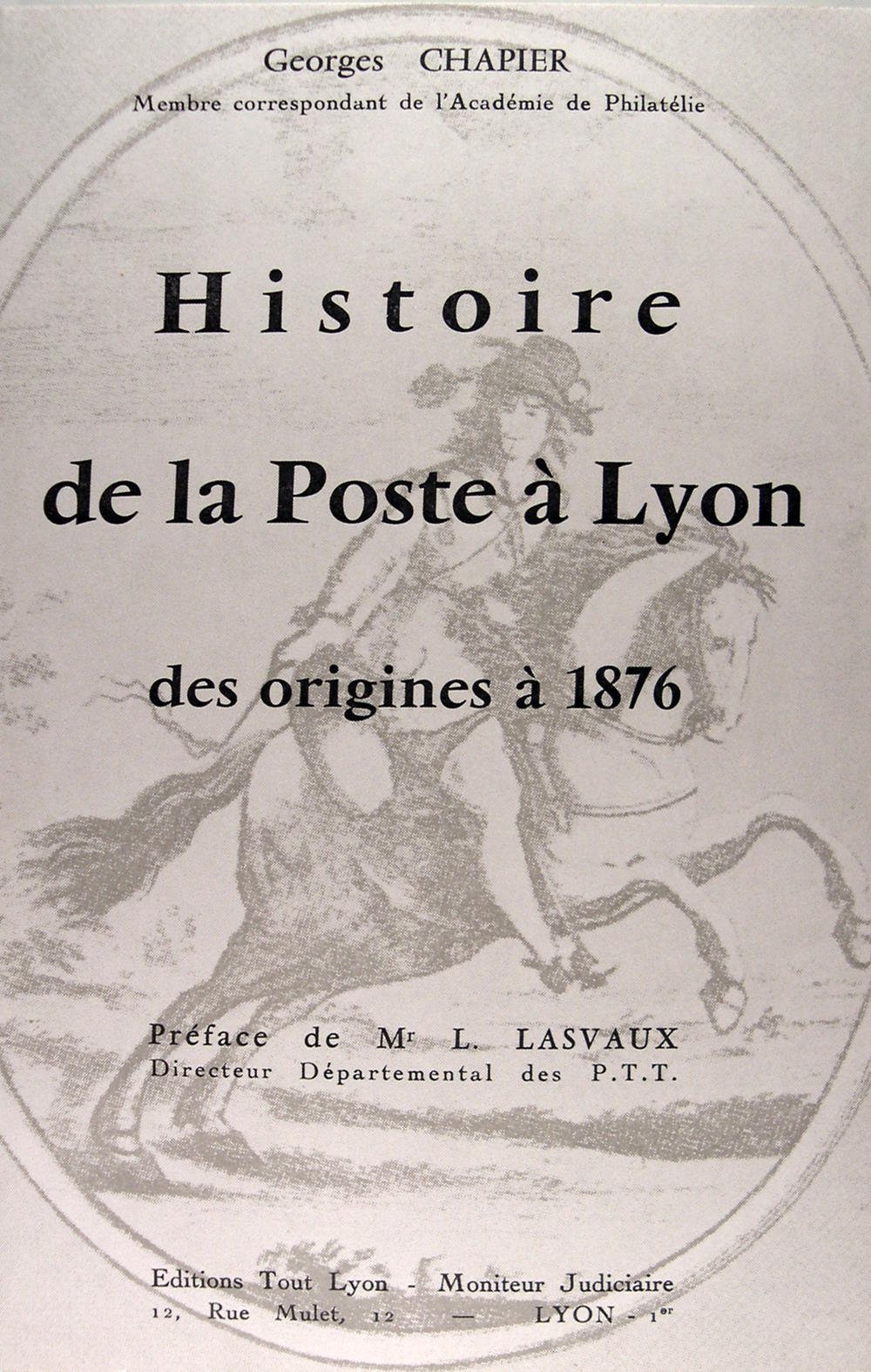Editions Tout Lyon, Lyon, 1965. In/8 broché, couverture illustrée, 95 pages, illustrations en noir. La poste des origines à 1778, de 1778 à la Révolution, Révolution et Empire, de 1814 à la naissance du timbre-poste (1er Janvier 1849) à 1876 : organisation générale, bureaux centraux de Lyon, Terreaux, Guillotière, Brotteaux, Croix-Rousse, Vaise, Camp de Sathonay, bureau temporaire de l’Exoposition Universelle, bureau de la Gare de Perrache.