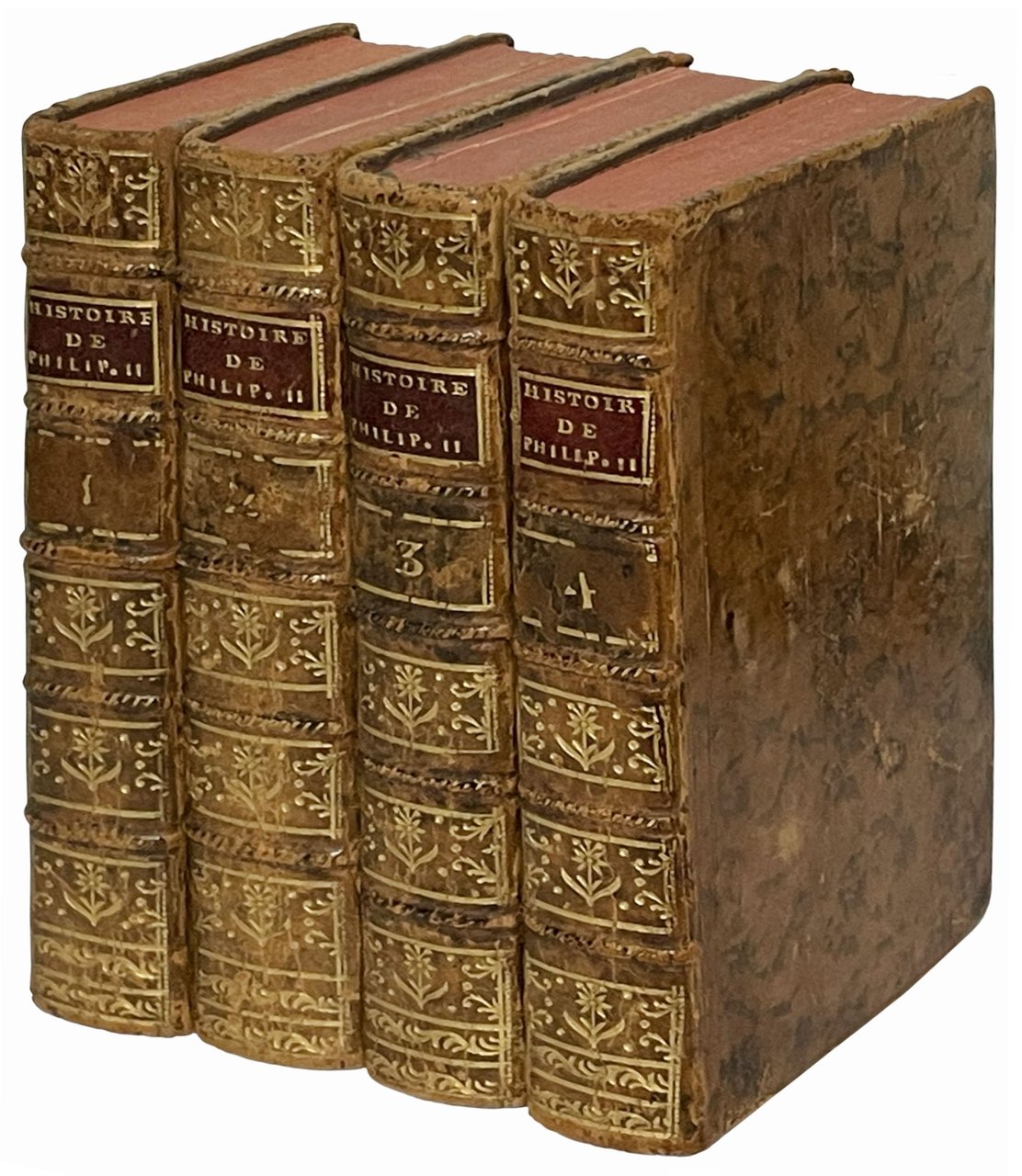 Quattro volumi in 12mo (mm 160x98); pp. (4), XLII, 310 (manca l'ultima bianca) e ritratto di Filippo II in antiporta; XII, 422 (manca l'ultima bianca); XII, 410 (manca l'ultima bianca); XII, 176, 138, 45, (1 bianca, manca l'ultima bianca). Bazzana coeva con fregi, tassello e titolo in oro al dorso, tagli rossi, risguardi in carta marmorizzata. Lievemente brunito. Ex-libris inciso dell'epoca C. G. Munarini.