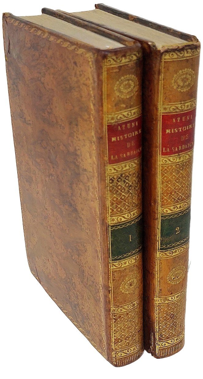 >2 vol. in-8, pp. XIX, 369; 404, bella leg. coeva pieno vitello marmorizaato, bordura oro sui piatti, dorsi ornati in oro e con due tasselli per i titoli. Prima ediz. definitiva della discussa opera del giurista sassarese Azuni (1749- 1826), già uscita parzialmente nel 1798 sotto il titolo di «Essai sur l'histoire...». Il primo volume è dedicato al campo politico, sociale e amministrativo, mentre il secondo costituisce un completo trattato naturalistico sulla fauna terrestre e ittica, la flora e i minerali dell'isola, assai dettagliata. Opera illustrata da una carta geogr. più volte ripieg. (cm 53x31), dis. e inc. da Perier, tratta da un originale dell'archivio Bogino segnalato dal Conte Balbo, una tav. di monete e 7 belle tav. finem. inc. in rame da Tardieu l'ainé, raffig. il muflone maschio e femmina, i rettili "lanzinafenu e tiligugu", un grifone e la tonnara (2 tav.). Da notare che il Piloni cita solo 5 tavole. Azuni studiò a Sassari, successivamente cadde in disgrazia di Vittorio Amedeo III e trovò poi l'appoggio di Napoleone. Per le sue pagine sull'isola, scritte con l'intento di offrire un quadro utile al miglioramento dei Sardi, fu duramente attaccato da alcuni contemporanei, che l'accusaronono di mancanza di ricerche. Bell'esemplare, completo (lievissimo alone d'umido nell'angolo delle ultime pp. del secondo vol.). Ciasca 1034. Fossati Bellani 4146. Piloni, Sardegna nelle incisioni, 1783-1787 (solo 5 tav.). Piloni, Carte geogr. tav. LXXXIII.