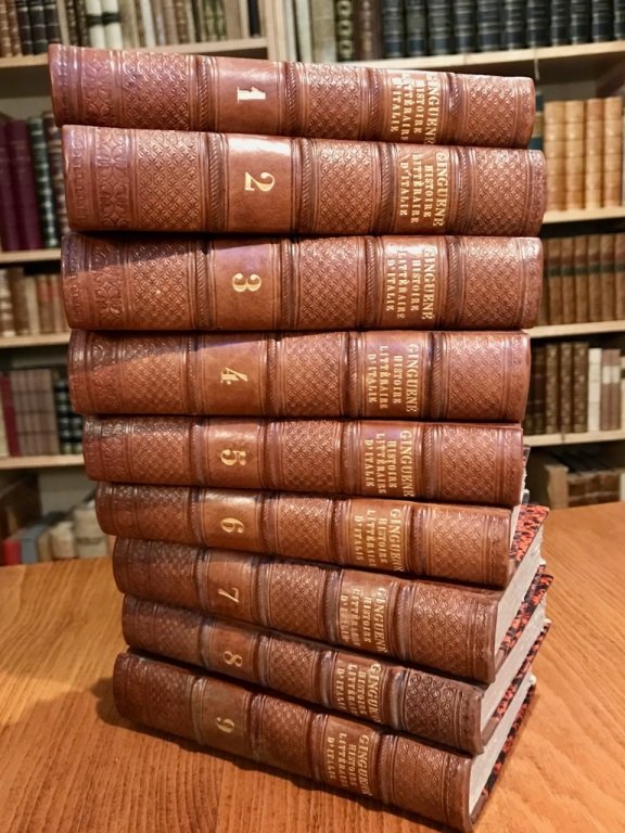 9 volumi in-8° (cm. 16,4), legature coeve in m. pelle con titolo in oro e fregi a secco ai dorsi, piatti e risguardi marmorizzati; carte in ottimo stato e fresche, con sporadiche fioriture. Opera più importante e famosa di Ginguené, una storia della letteratura italiana (con ampio spazio alla critica letteraria) a cui Franco Salfi aggiungerà poi una sua continuazione. Cfr. Brunet II, 1602; Graesse III, 85. Ottimo esemplare.