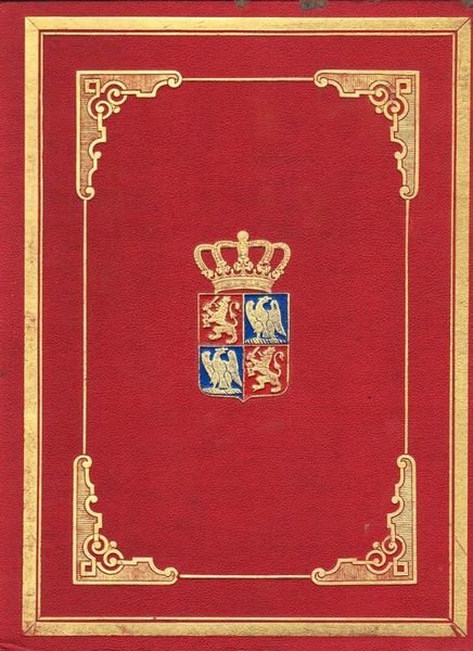In-4°, bella legatura d'epoca, pp. XII-224; seguono le XV tavole litografiche stampate da Blanken (Amsterdam); in antiporta medaglione col gran sigillo imperiale. Firma autografa dell'autore alla pagina del copyright. Legatura in tutta tela rossa alle armi con titoli e fregi in oro al dorso, e cornici in oro ai piatti. L'arme - uno scudo sannitico inquartato e coronato; al primo e al quarto d'argento (?) al leone rampante coronato d'oro armato di spada e frecce, al secondo e terzo d'azzurro all'aquila imperiale d'oro - ha elementi del blasone del Regno dei Paesi Bassi e del Primo Impero. Rara prima edizione, della quale non abbiamo reperito alcun esemplarein vendita.
