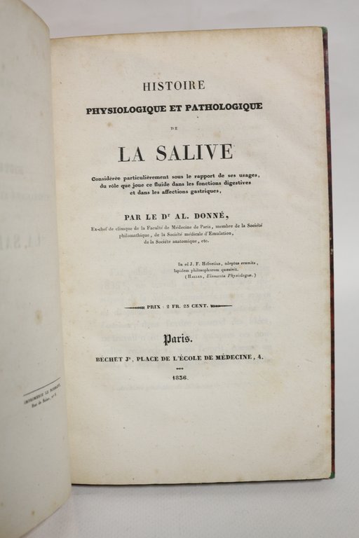 Histoire physiologique et pathologique de la salive considérée particulièrement sous le rapport de ses usages, du rôle que joue ce fluide dans les fonctions digestives et dans les affections gastriques