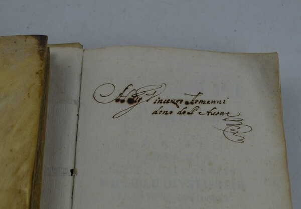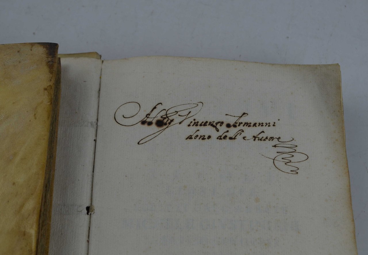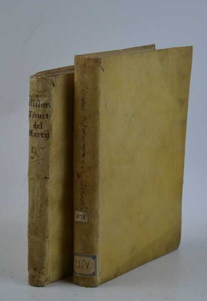 Due volumi di cm. 19,5 e 21,5, pp. (32) 264 (8); (24) 272 (64). Bella legatura coeva in piena pergamena semirigida con titoli manoscritti ai dorsi, lievemente difforme nei due volumi. Piccole gore sparse e poche bruniture, complessivamente volumi genuini e molto ben conservati. Il secondo volume comporta una bella dedica manoscritta dell'autore a Vincenzo Armanni, celebre storico e letterato nativo di Gubbio. Opera rara, soprattutto quando completa delle due parti che ebbero anche circolazione autonoma. Cfr. Lozzi 5347.